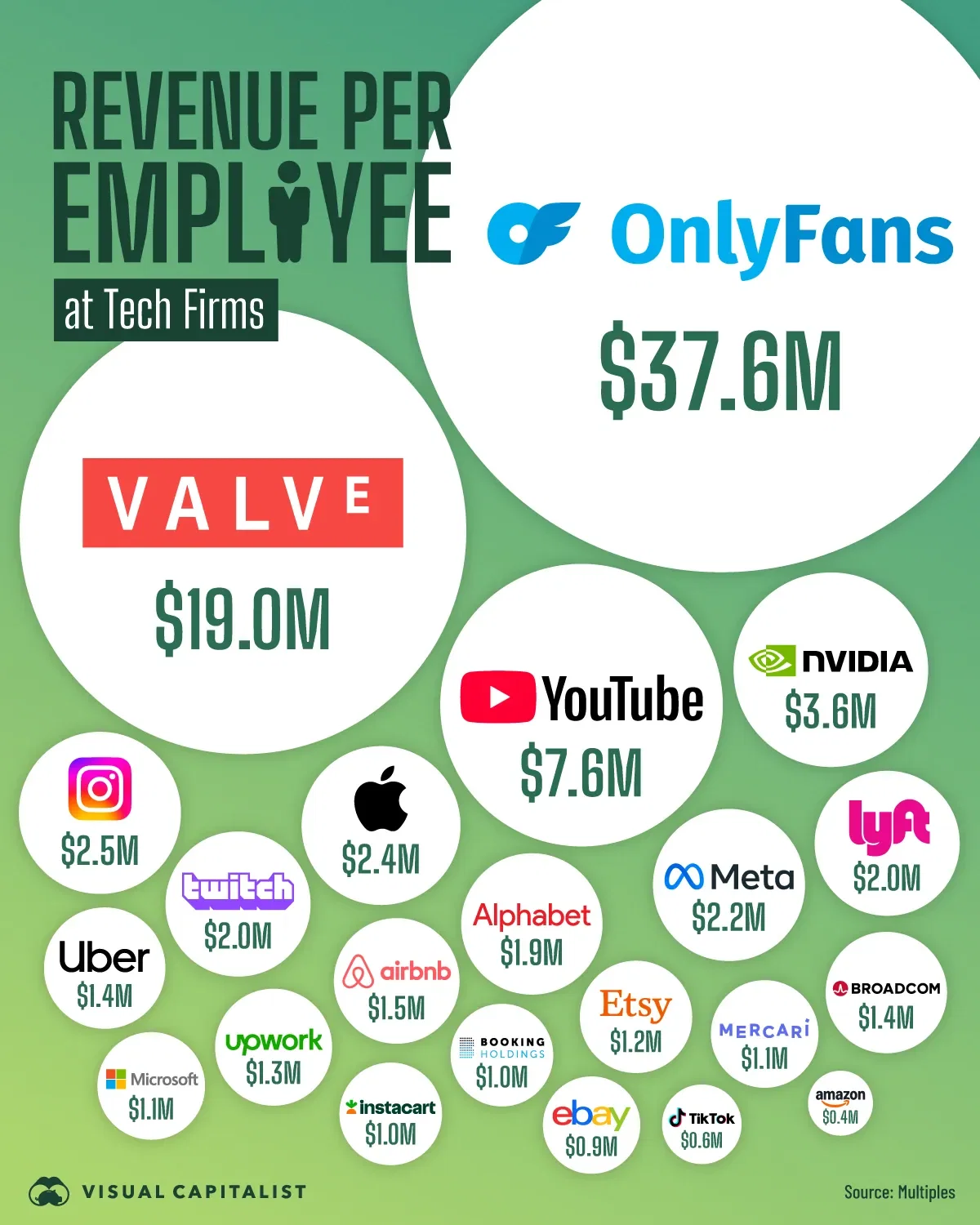 Платформа OnlyFans стала однією з найефективніших компаній у світі за рівнем доходу на одного працівника. У 2024 році компанія заробила 37,6 мільйона доларів на кожного співробітника.