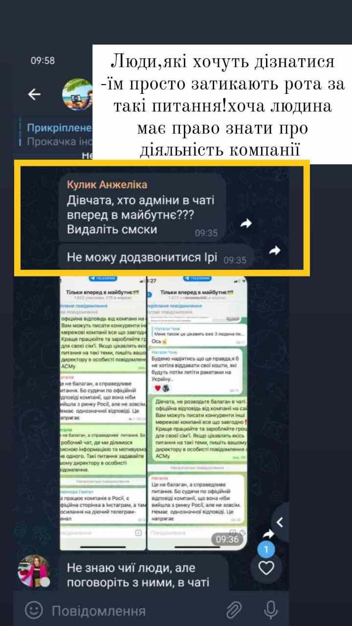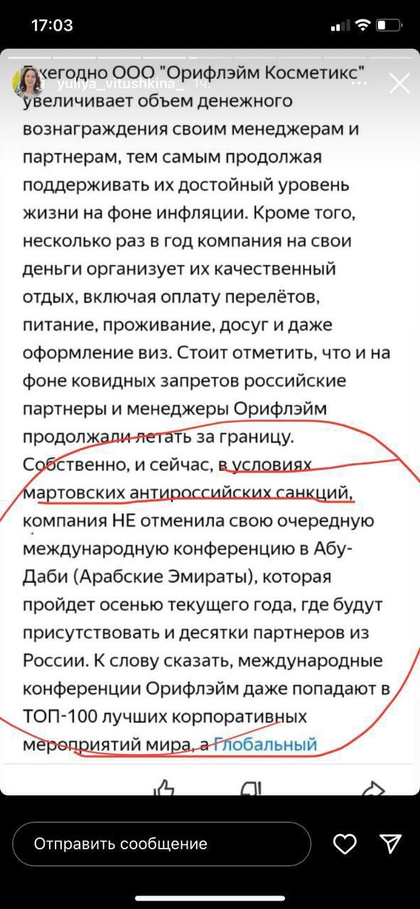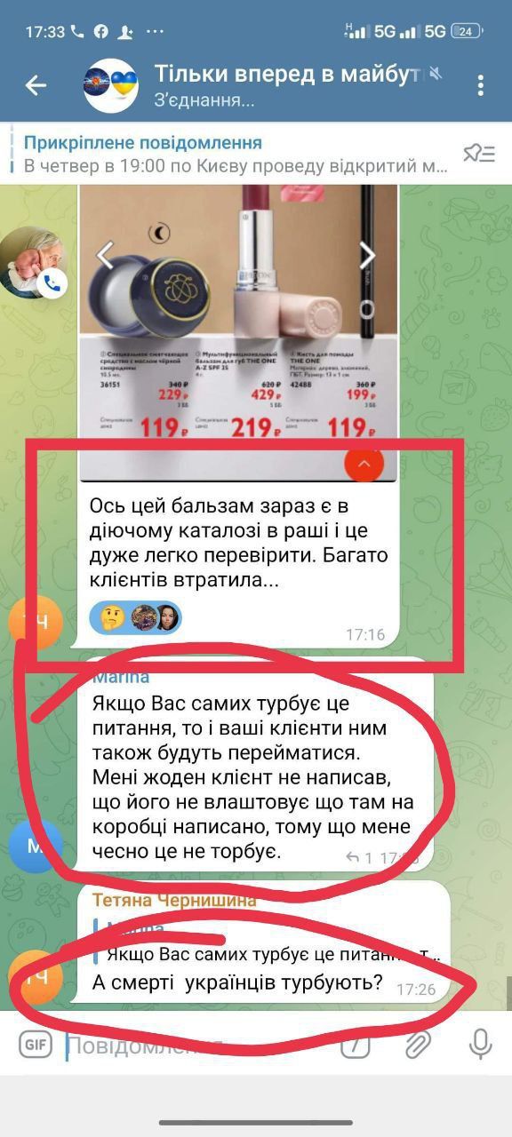 В усій цій історії дивує і те, якої позиції дотримуються українські представники Oriflame. До прикладу, одна із топлідерів Ірина Яременко закликає на навчанні своїх партнерів не висвітлювати війну та не негативити щодо цього (робити репости із робочих сторінок щодо зборів для військових тощо).