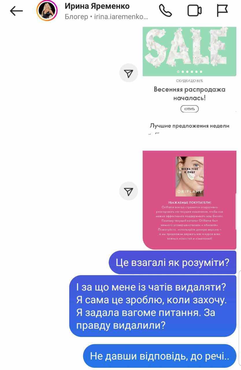 Oriflame не збирається йти з російського ринку / Скриншот надала Тетяна Пахалюк