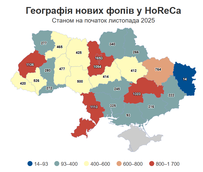 Водночас за той самий період свою роботу припинили 10 645 ФОПів у сфері кафе та ресторанів. Загалом цьогоріч приріст нових підприємців склав +2 728 заклади, що удвічі менше, ніж торік. Найбільше нових ФОПів у HoReCa (скорочення від Hotel, Restaurant, Cafe) цьогоріч відкрили:
