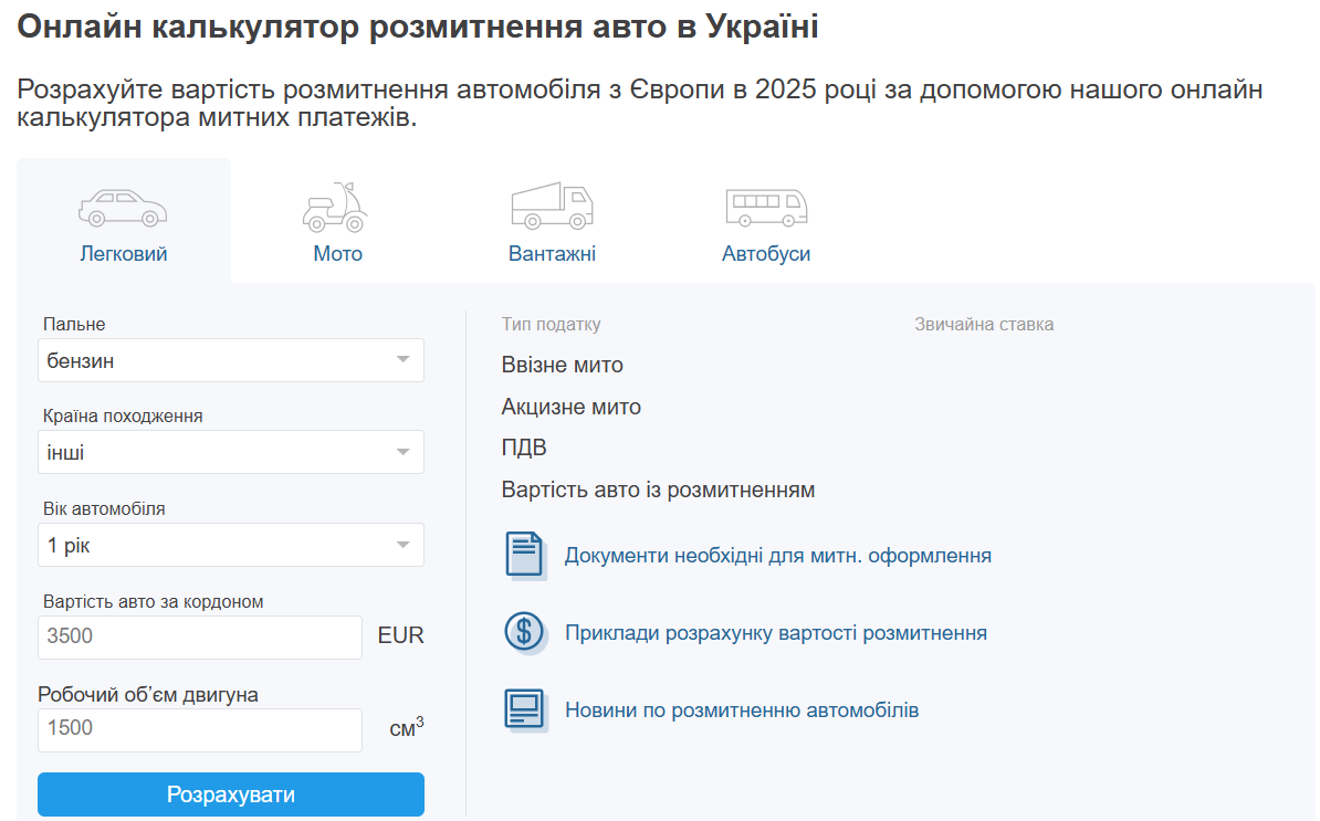 Для точного обрахування можна скористатися калькулятором розмитнення, який коректно автоматично об’єднує всі дані, щоб ви отримали точну суму обов’язкових платежів без переплат.