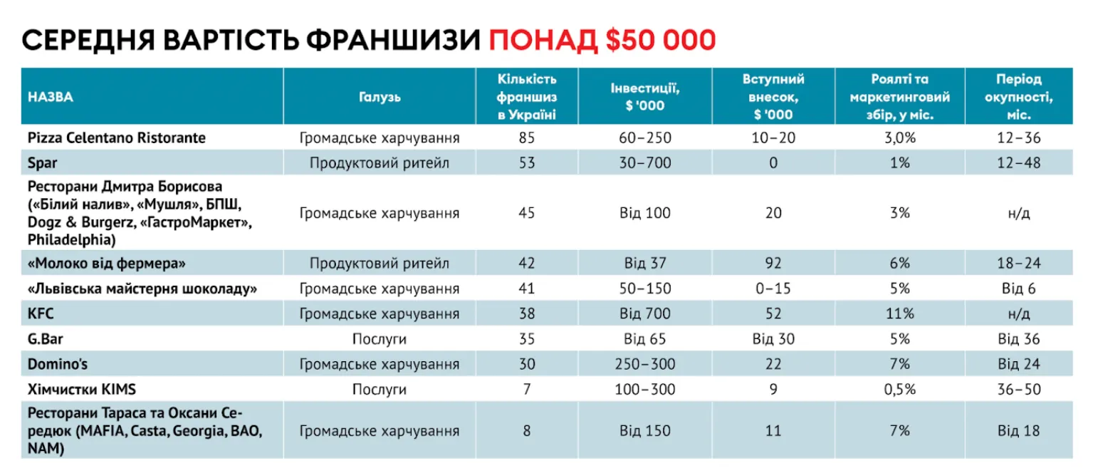 Самые популярные среди самых дорогих франшиз – более 50 тысяч долларов: