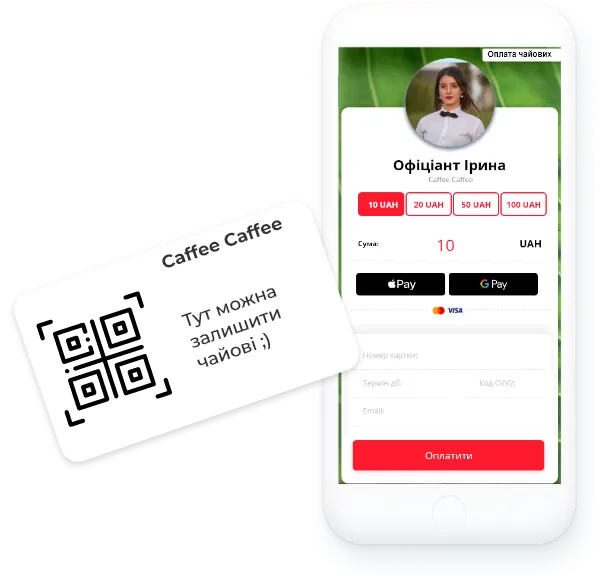 Сервис создает интернет-страницу для платежей, с помощью которой клиент может оставлять чаевые. Страницу можно стилизовать: добавить логотип или фото заведения, выбрать цветовую гамму, указать платежные методы и номер карты, на которую будут поступать средства.