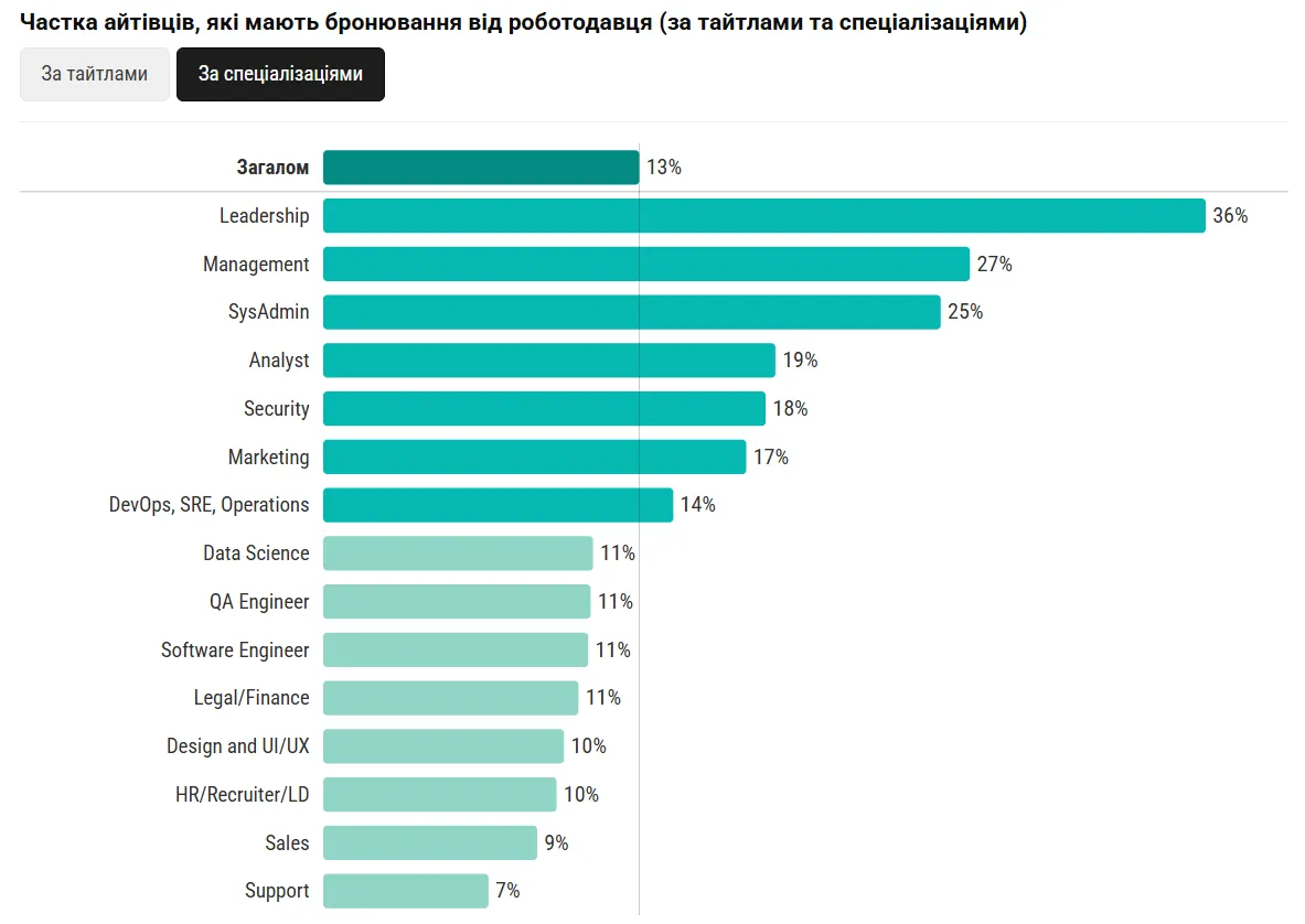 - Меньше всего забронированных среди мидлов (9%) и джунов (3%). Что касается последних – многие из них еще не подлежат мобилизации по возрасту.
