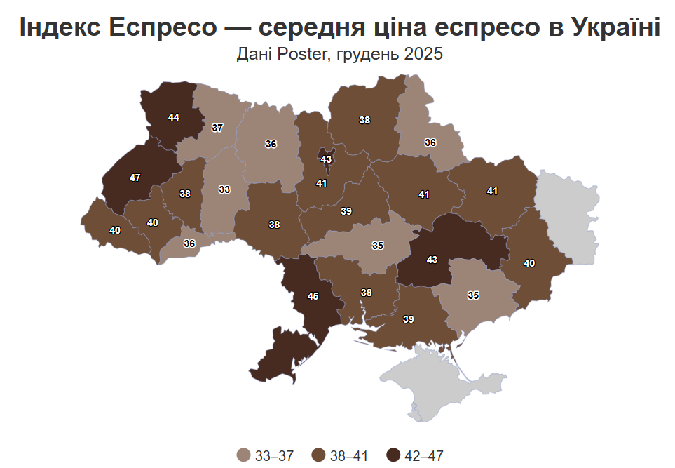 Дороже всего эспрессо сейчас пьют на Львовщине – в среднем 47 гривен за чашку. За год цена здесь выросла на 19%. Регион впервые за последние годы возглавил "кофейный рейтинг", вытеснив многолетнего лидера. Одесская область, которая два года подряд была рекордсменом по ценам на кофе, в декабре 2025 года оказалась на втором месте – 45 гривен за эспрессо.