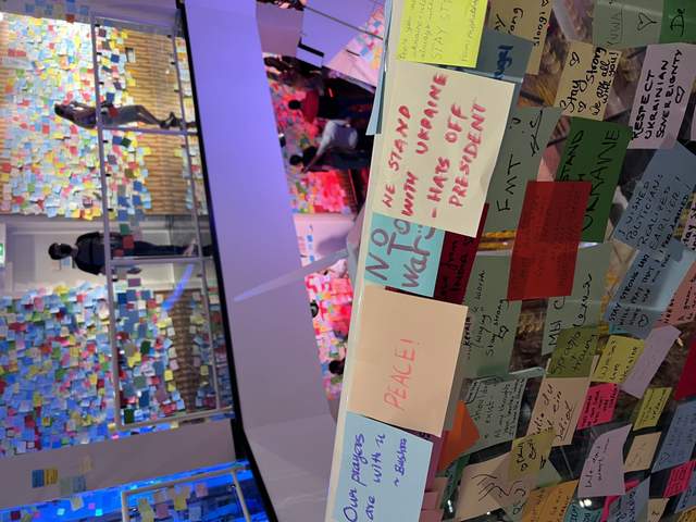 Украинская команда отмечает, что люди со всего мира сейчас хотят узнать об Украине – стране героев: они теперь оставляют тысячи листовок со словами поддержки, которыми уже оклеены два этажа, и записывают мотивационные видеообращения к украинцам.