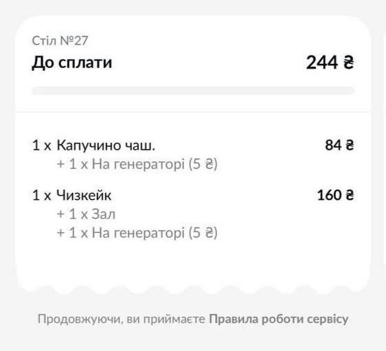 На просторах соцсетей, в частности в Threads, некоторые клиенты украинских заведений поделились чеками, где клиенты отдельной строкой указана доплата "на генераторе".