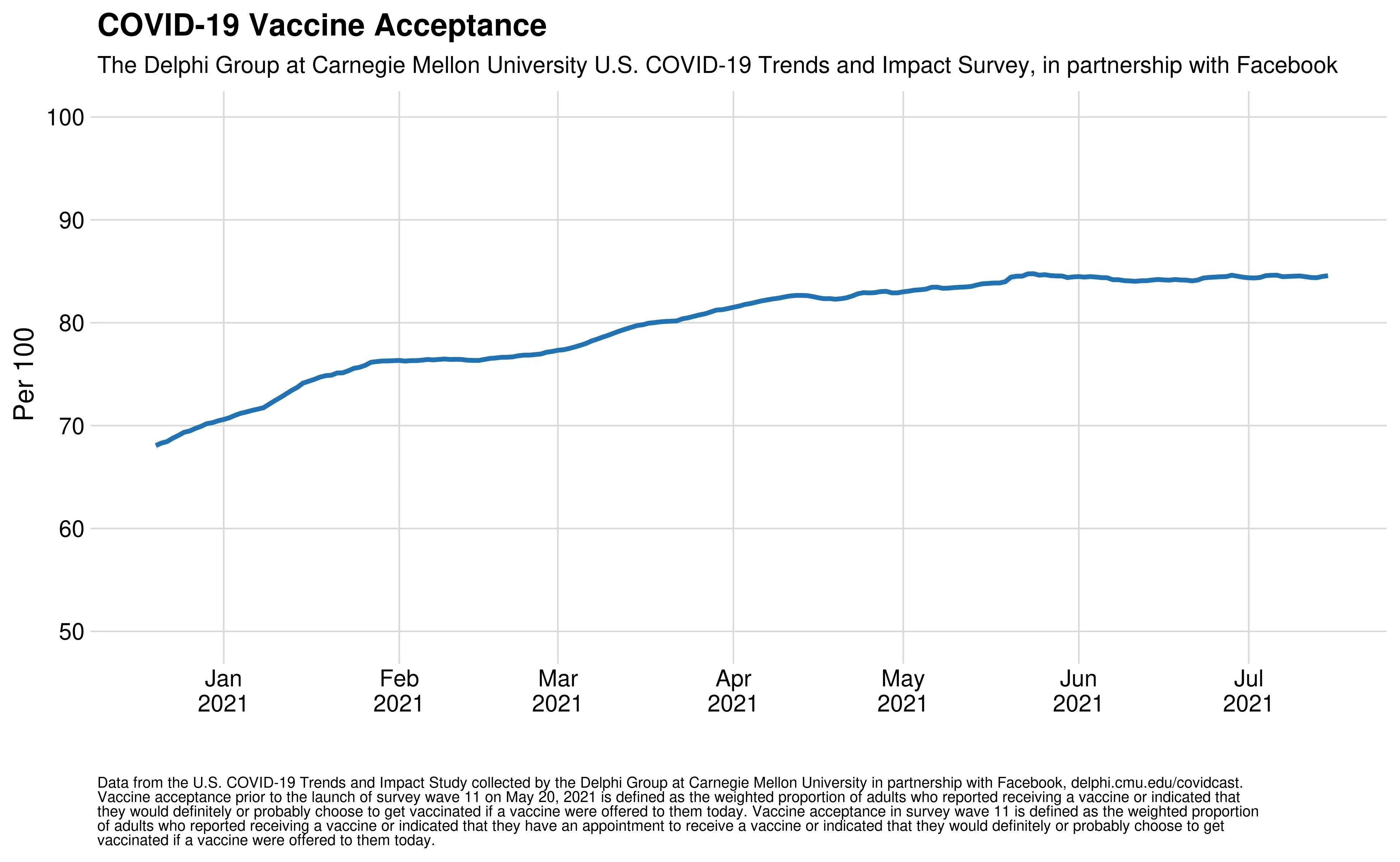 Также были представлены графические данные, свидетельствующие о том, что уровень восприятия вакцин среди пользователей Facebook в США вырос на 10-15% с января 2021 года: с 70% до 80-85%.