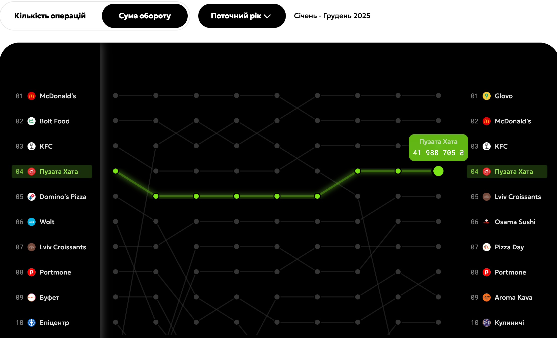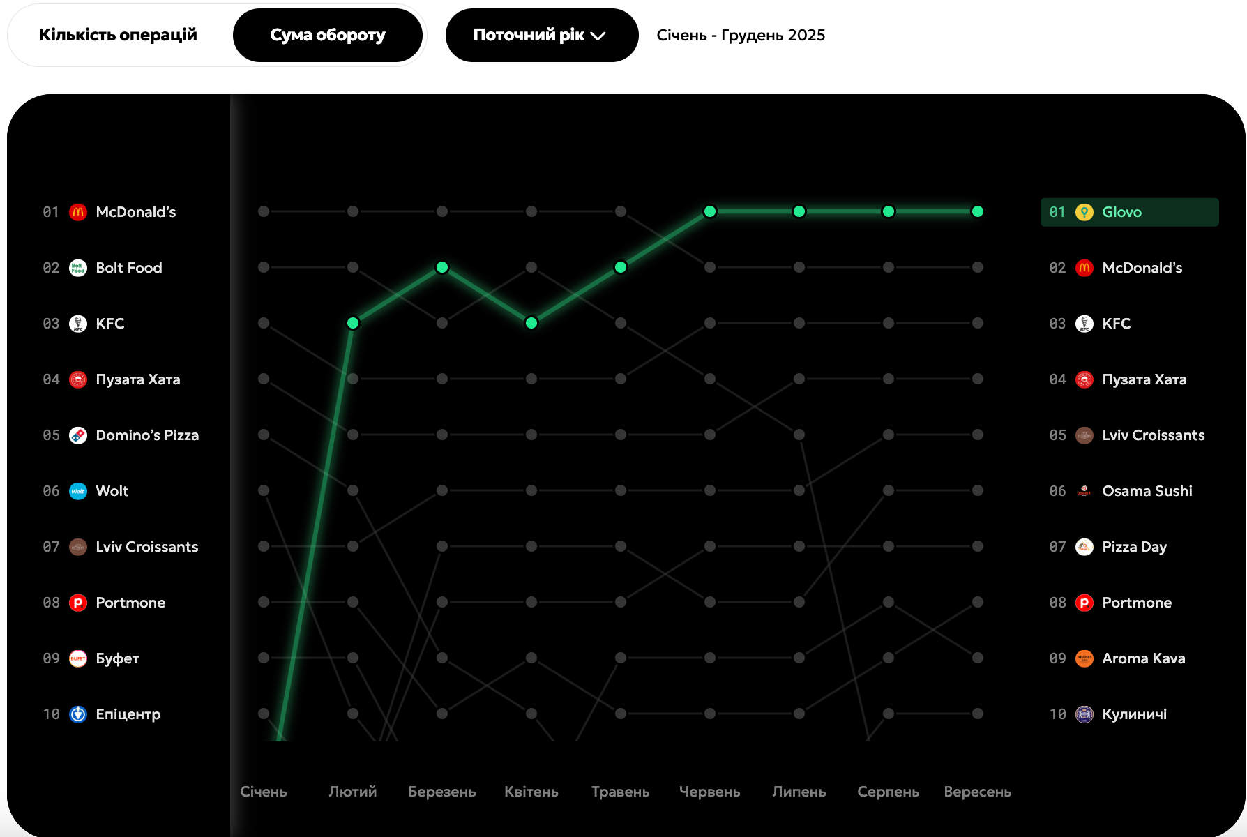 В категории "Рестораны и кафе" по количеству операций лидирует McDonald's. Далее следуют сервисы доставки Glovo и Bolt Food, за ними – KFC, "Пузата Хата", Domino's Pizza, Вольт, Львовские круассаны, Портмоне, Bycet и Entree.
