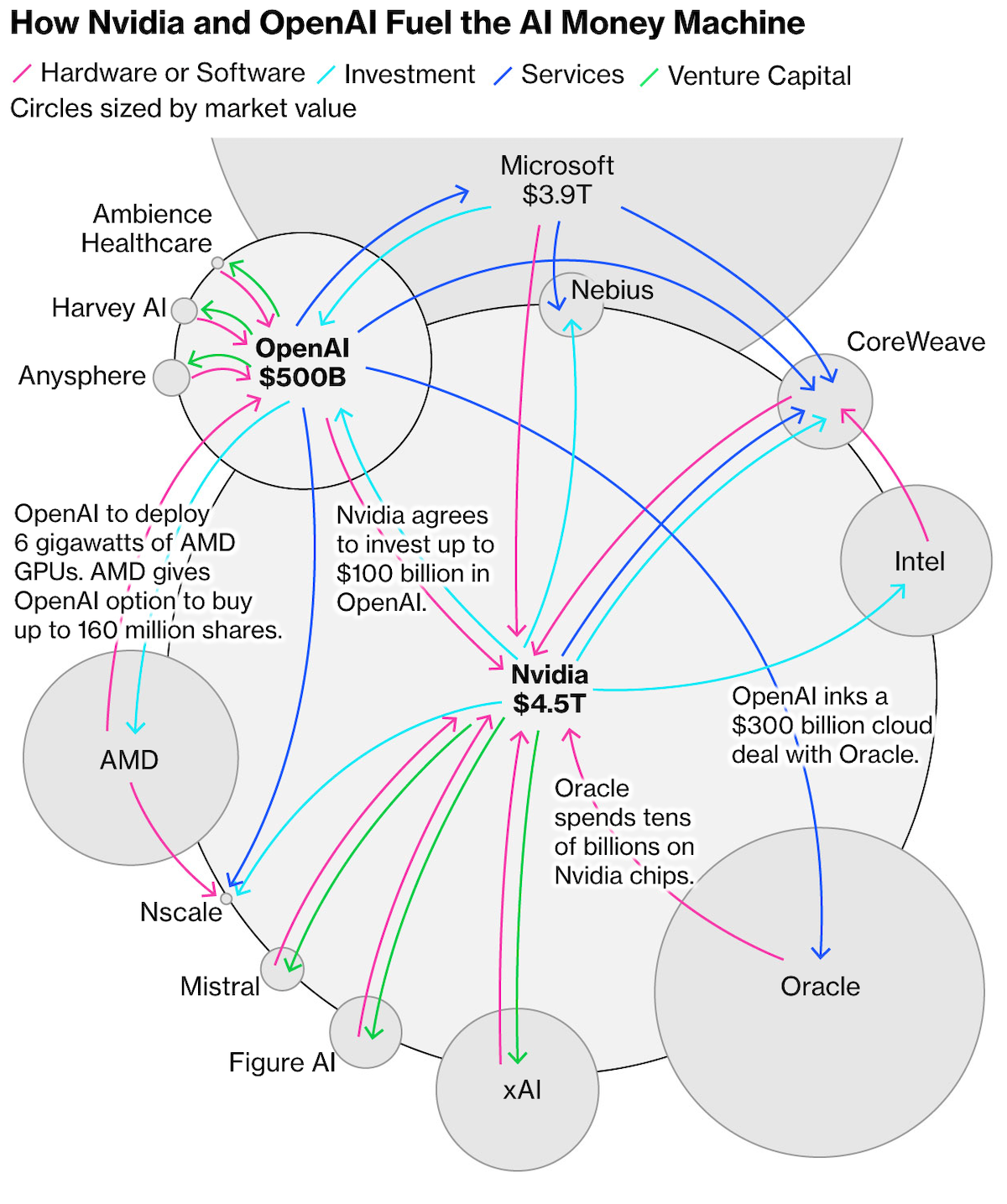 Один из поводов для разговоров о пузыре – неслыханные масштабы и характер инвестиций в ИИ. Только один стартап OpenAI заключил ряд соглашений, которые фактически создают замкнутый круг финансовых вливаний.