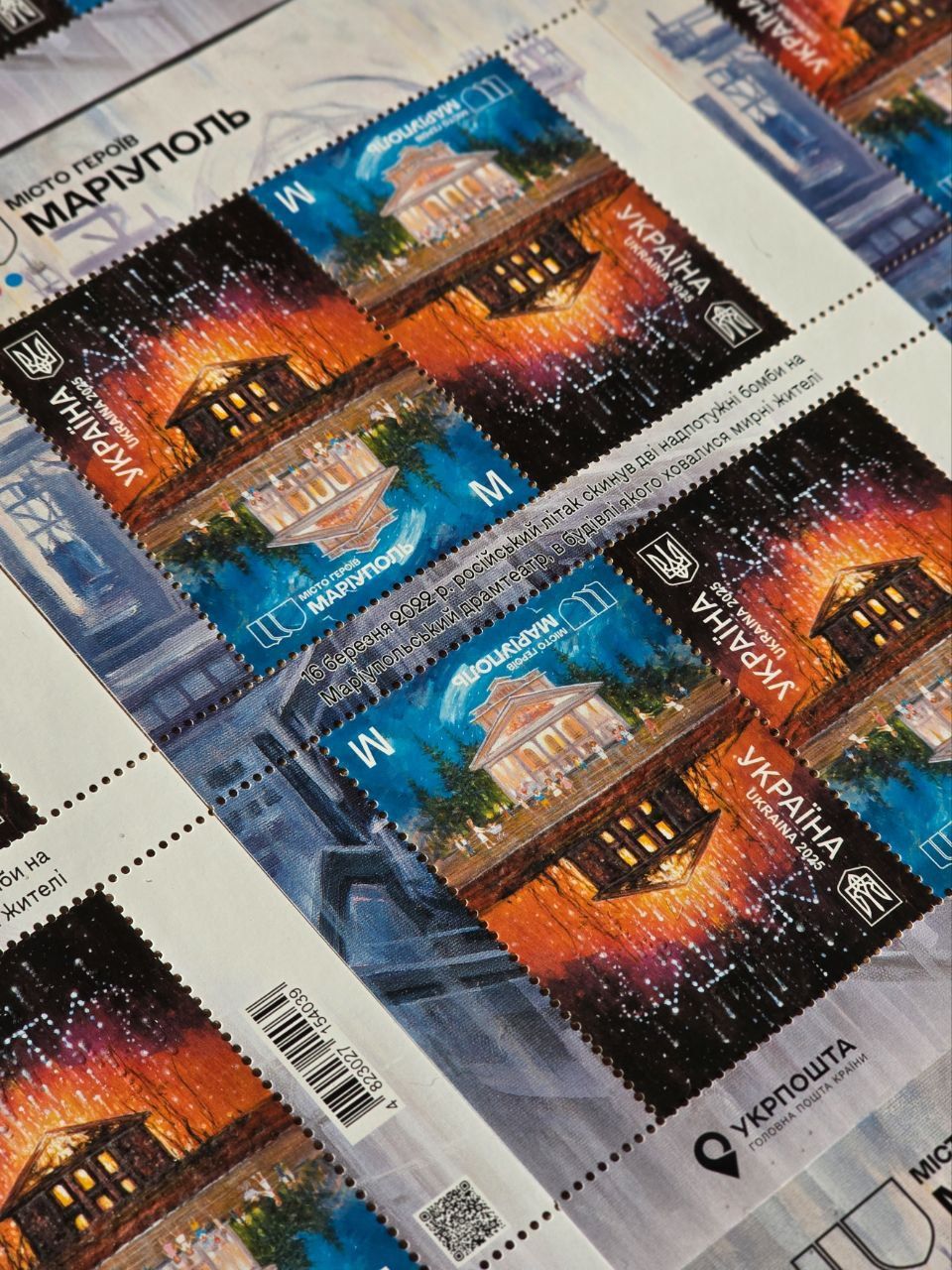 Основным мотивом на марках стало изображение Мариупольского драмтеатра после разрушений от российского удара, сообщили в "Укрпочте", информирует 24 Канал. Зеркальное отражение театра на марке символизирует его культурную значимость до войны, когда это было сердце города – место для праздников и концертов.