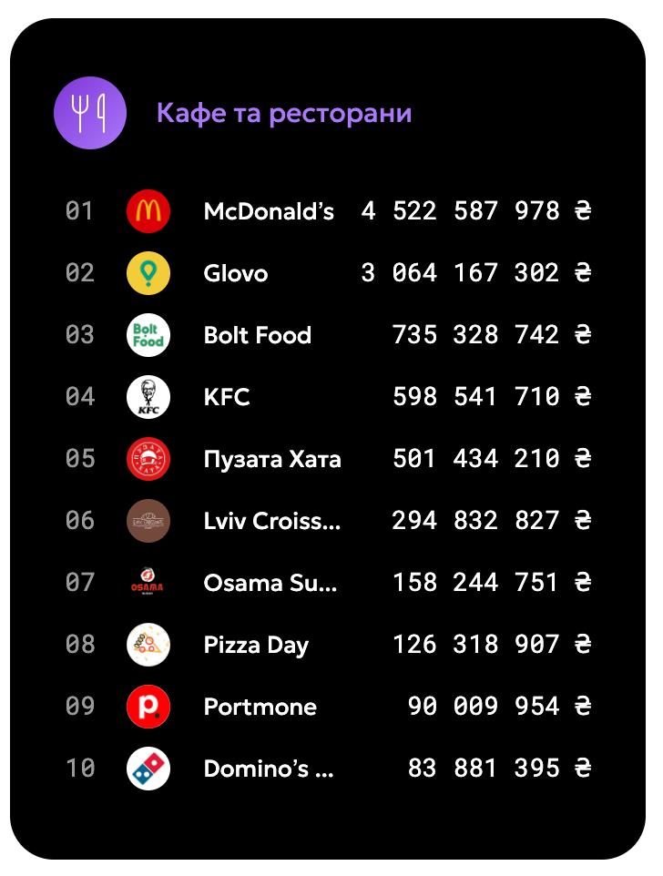 По количеству операций в категории "Рестораны и кафе" на первом месте McDonald's, далее следуют сервисы доставки Glovo и Bolt Food, а за ними – KFC, "Пузата Хата", Domino's Pizza и другие.