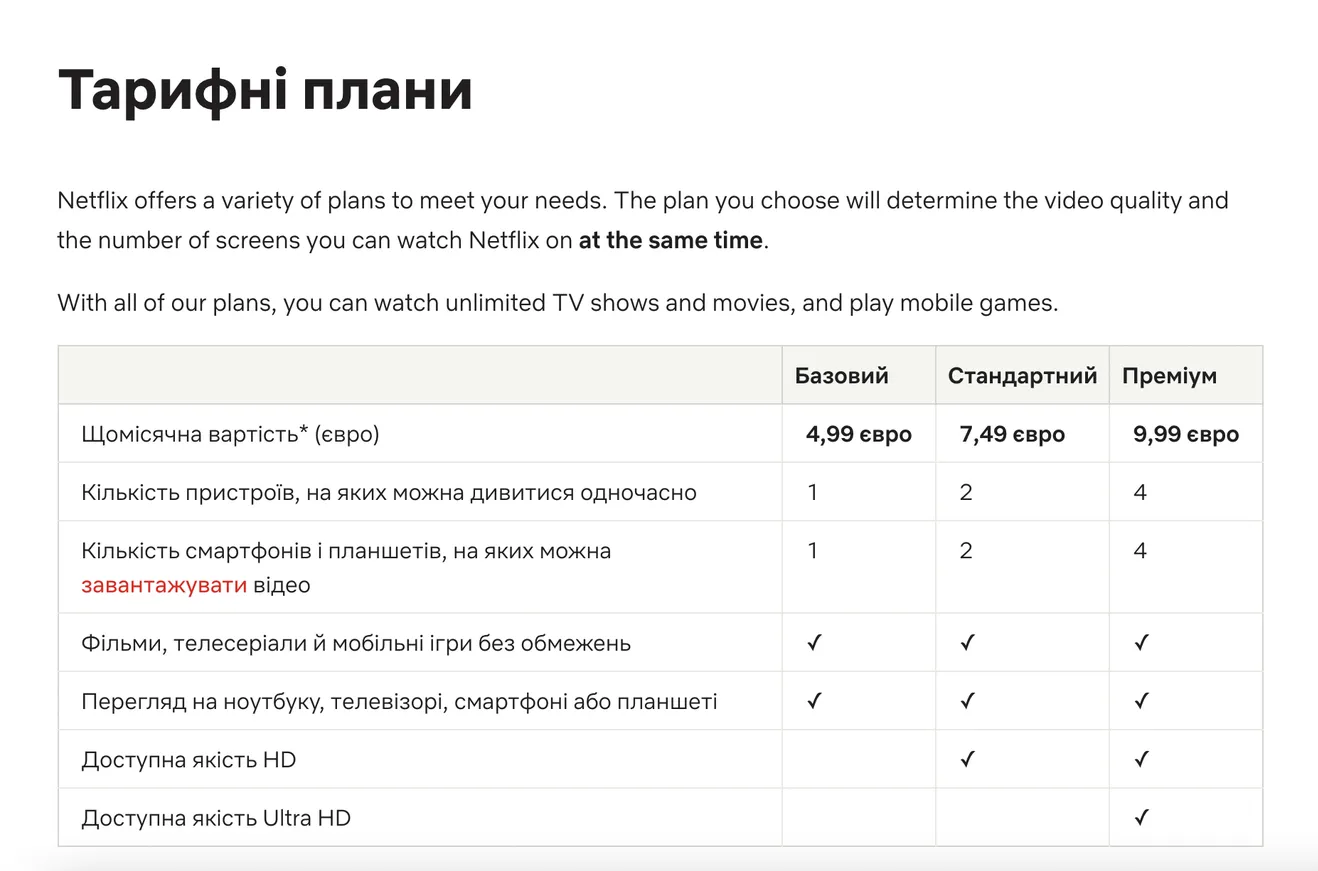 Новая стоимость подписок Netflix для украинцев / Скриншот сайта Netflix