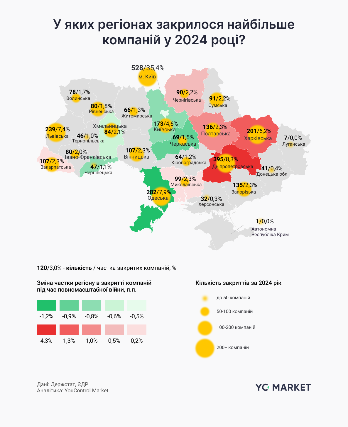 В целом, в Украине была приостановлена деятельность почти 3300 компаний. Больше всего закрытий зафиксировано в Киеве – 528, в Днепропетровской области – 395, в Одесской – 282, во Львовской – 239 и в Харьковской – 201.
