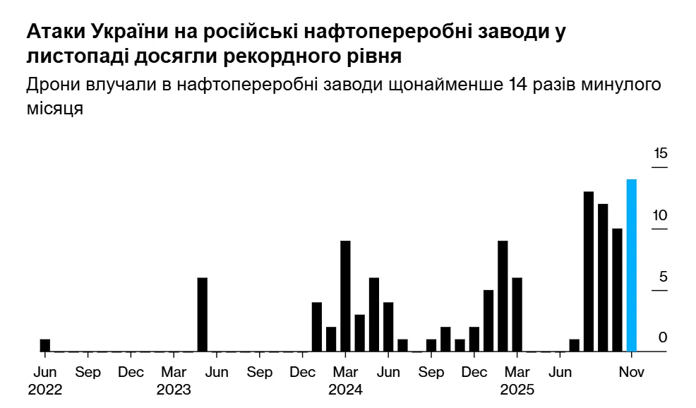 Количество дроновых атак Украины по НПЗ России / инфографика Bloomberg