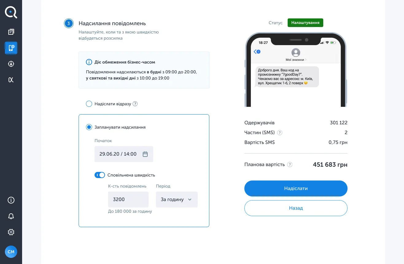 Работать с промокампаниями в ADWISOR от Киевстар очень удобно, буквально на раз-два-три: это легко, быстро и точно. Задайте параметры таргетированной SMS-рассылки – и ждите результат. А он не замедлит!
