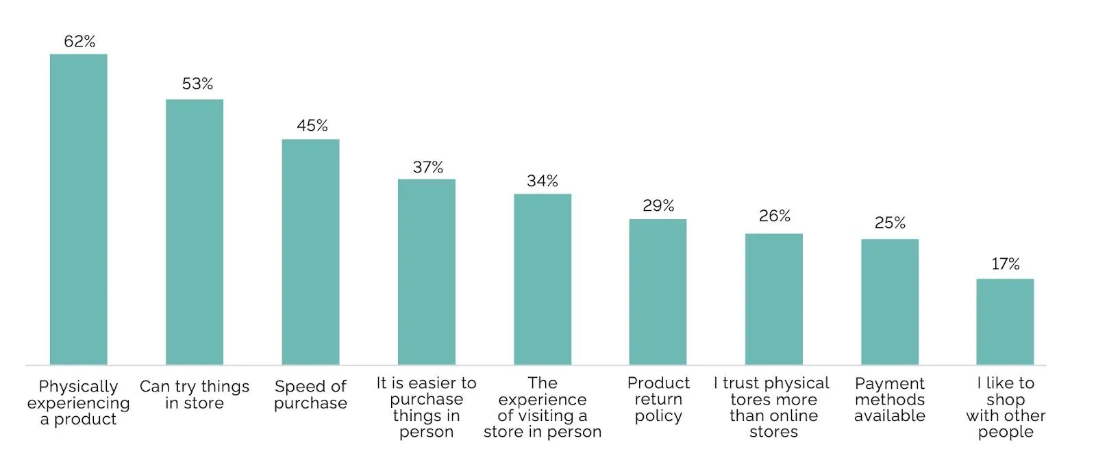62% потребителей совершают покупки в физических магазинах, потому что там можно увидеть товар воочию, попробовать его на ощупь и тому подобное. Ни одна современная технология пока не способна полностью повторить эффект от физического контакта с продуктом. Также магазины выигрывают в общей скорости транзакции, особенно когда потребности неотложные.