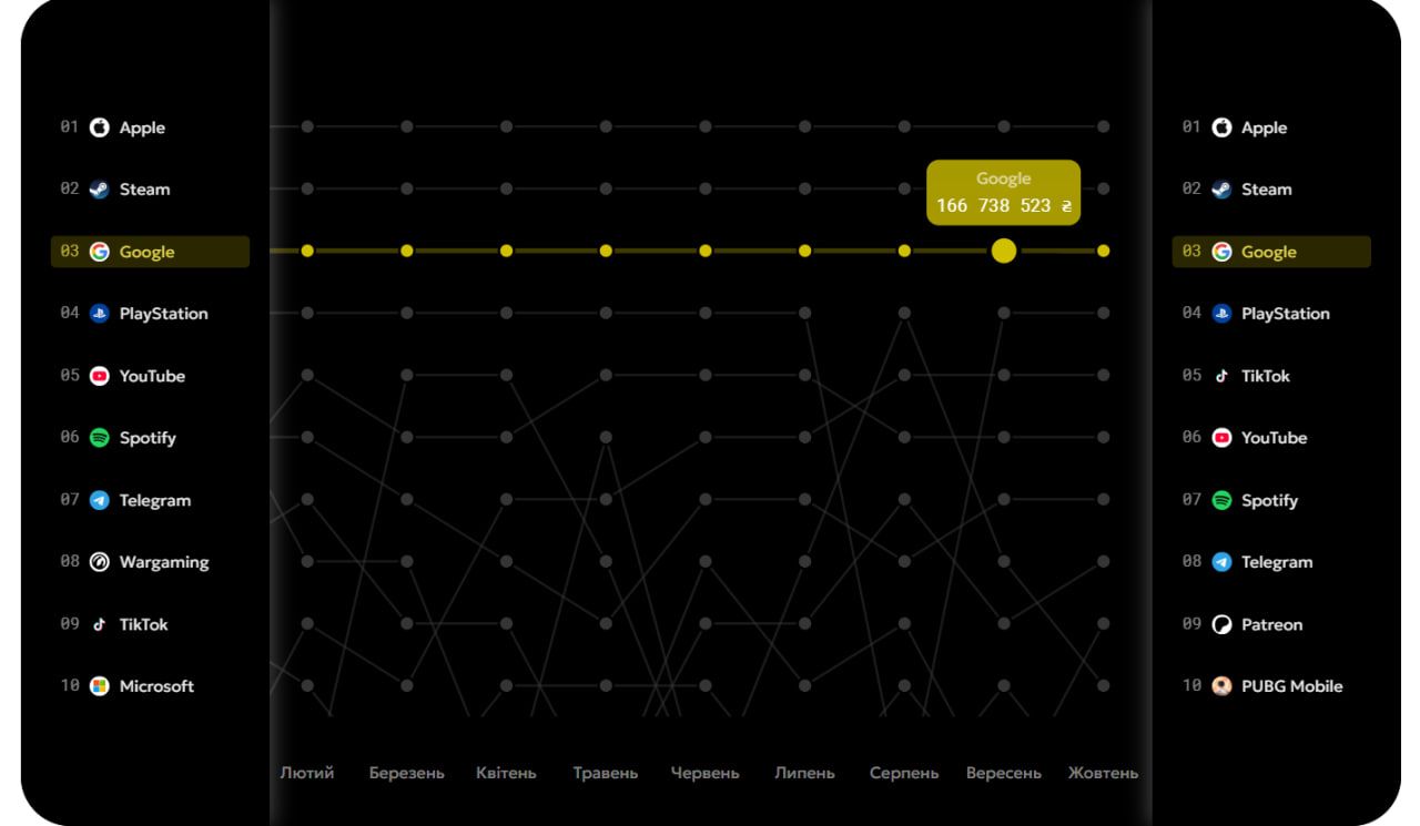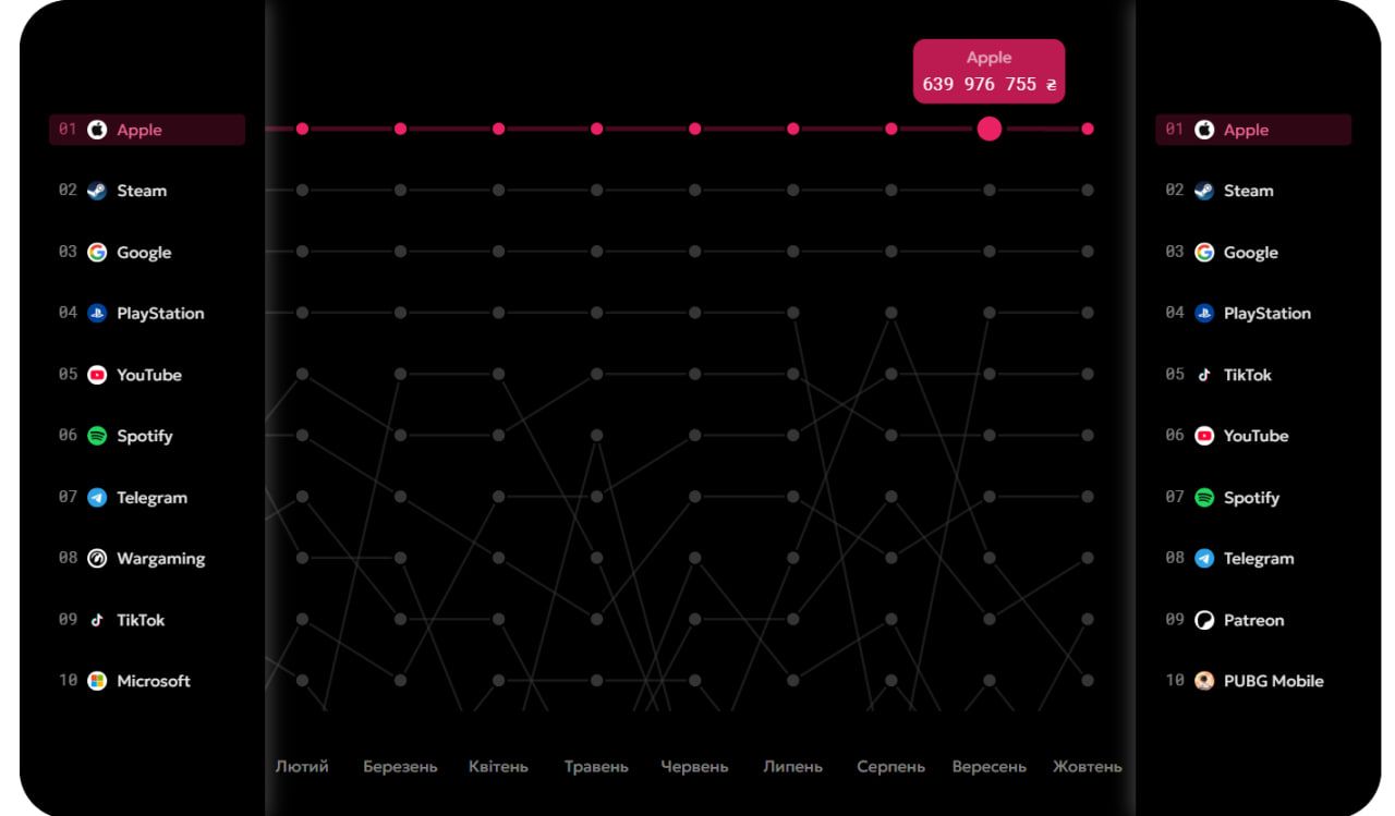 - Первое место по затратам занял сервис Apple – почти 640 миллионов гривен,