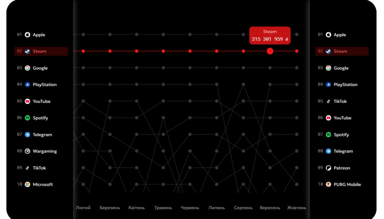 - Второе место принадлежит Steam – 315,3 миллиона гривен,