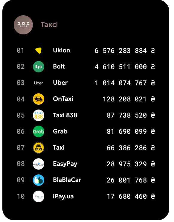 - Uklon лидирует с расходами 6,57 миллиардов гривен, опережая Bolt (4,61 миллиардов) и Uber (1,01 миллиард).
