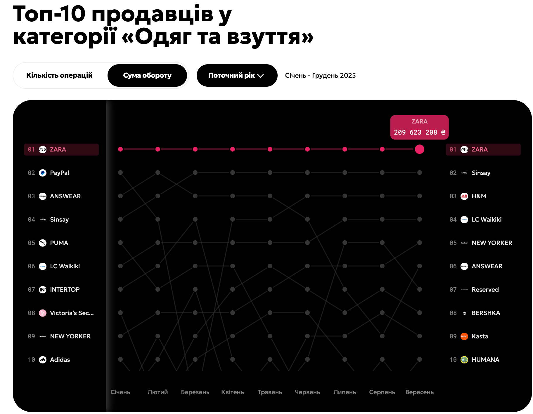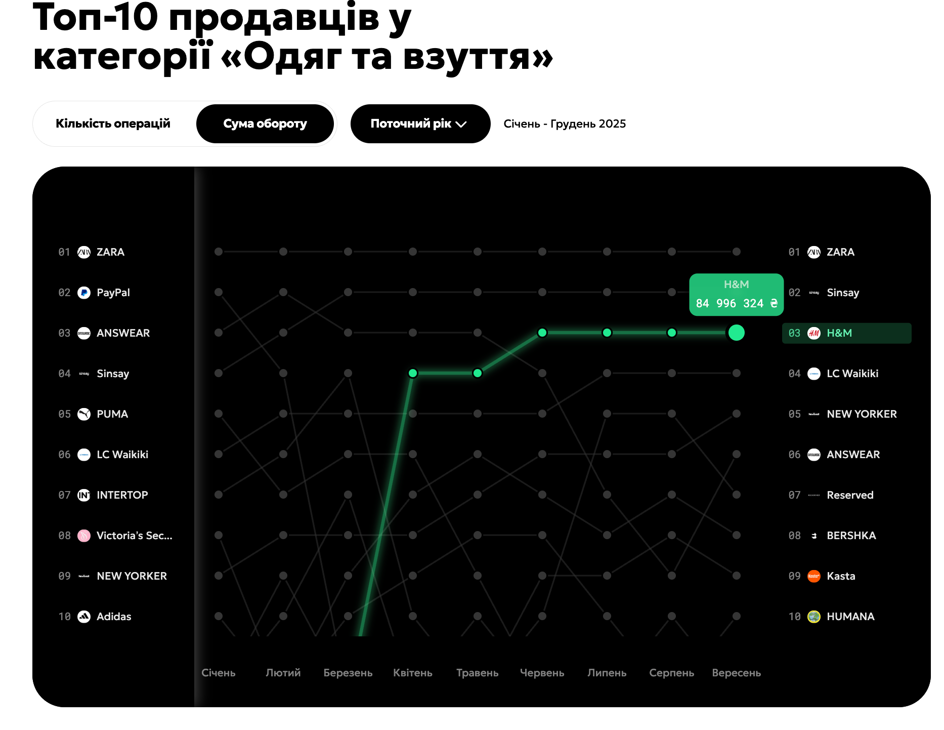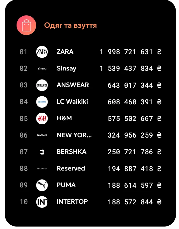 Эти два бренда существенно вырываются вперед, что свидетельствует о высоком спросе на недорогую, но трендовую одежду среди украинцев. Подробнее о том, в каких магазинах чаще всего покупают вещи украинцы, и кто лидирует среди fashion-брендов по объемам расходов, рассказывает 24 Канал, анализируя дашборд Monobank.