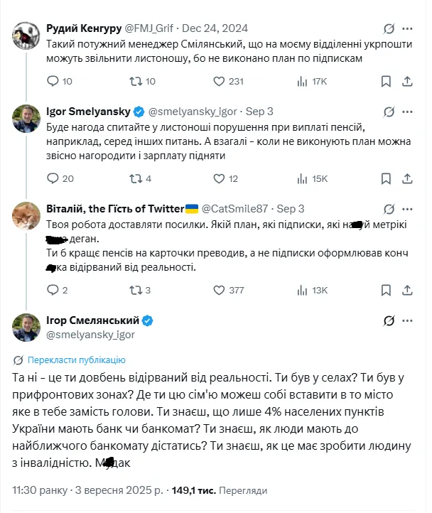 Конфликт начался с поста пользователя X с ником Рыжий Кенгуру, который написал: "Такой мощный менеджер Смелянский, что на моем отделении "Укрпочты" могут уволить почтальона, потому что не выполнен план по подпискам".