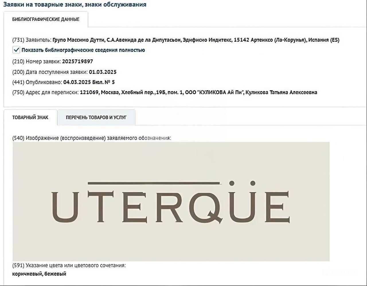 Кроме того, бренд Massimo Dutti, входящий в состав Inditex, подал заявку на регистрацию марки Uterqüe для изделий из кожи, сумок, одежды и обуви. Ранее под этим названием работала сеть магазинов модной одежды и аксессуаров, которую Inditex решил интегрировать в Massimo Dutti в 2021 году.