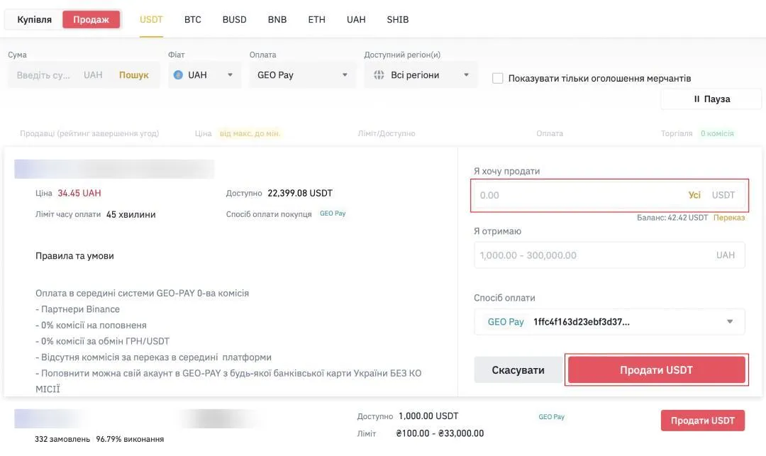 Как продать USDT с помощью GEO P2P
