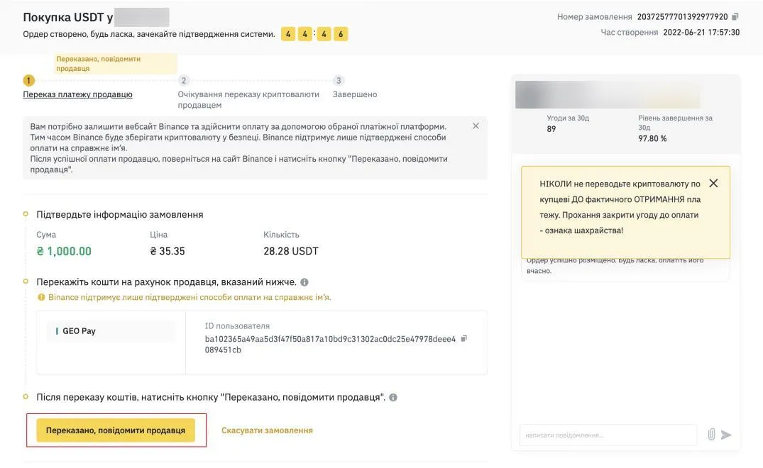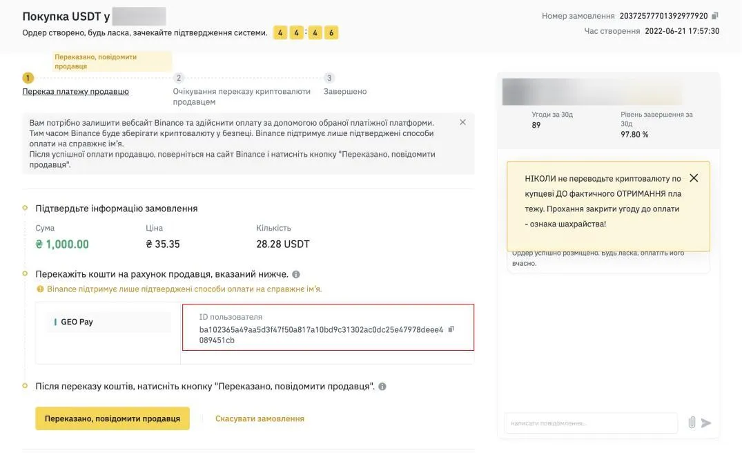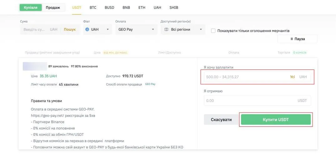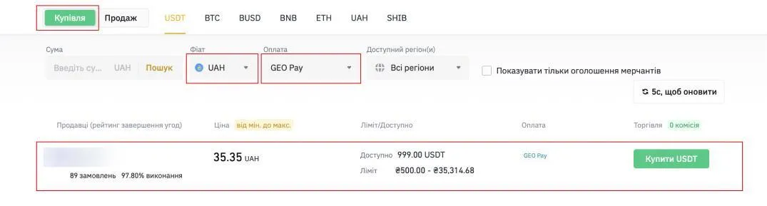 Шаг 4. Перейдите в раздел P2P торговли. Нажмите кнопку "Покупка", выберите валюту UAH и способ оплаты GEO Pay. После указанных действий найдите ордер от компании GEO Pay и нажмите кнопку "Купить USDT".