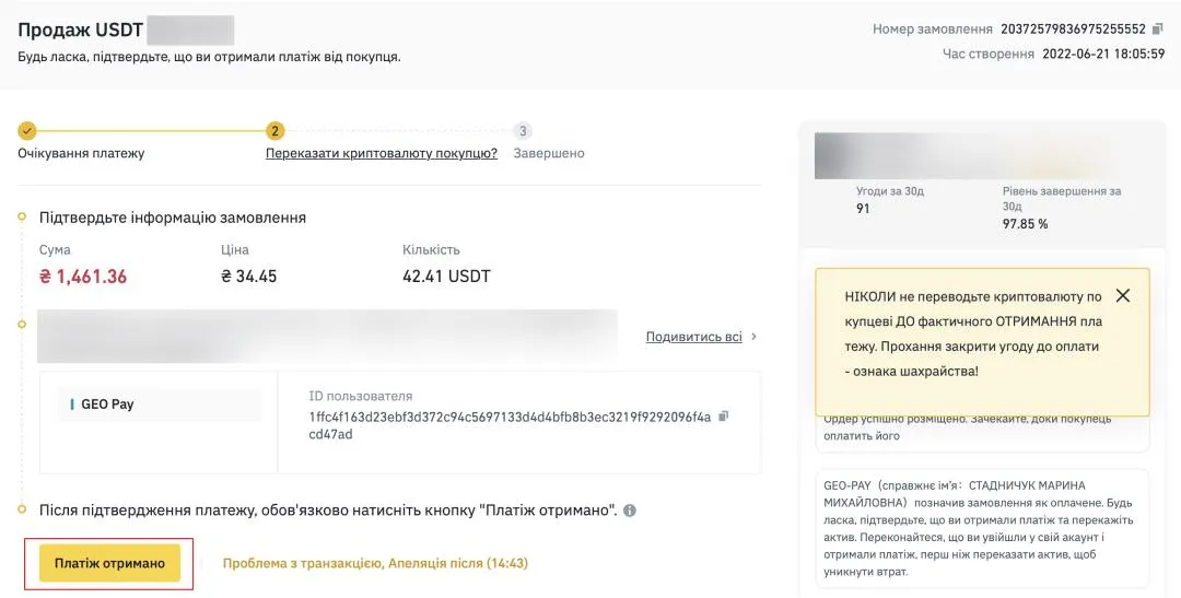 Шаг 7. Отправьте сумму USDT на указанный баланс на Binance и подтвердите получение средств на ваш баланс GEO Pay.