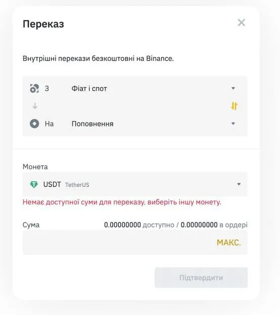 Шаг 2. На бирже переведите USDT из "Фиат и спот" на "Пополнение" (на скриншотах – пример Binance).