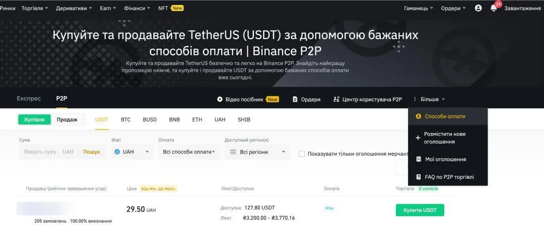 Шаг 2. Перейдите в раздел "P2P" и "Способы оплаты".