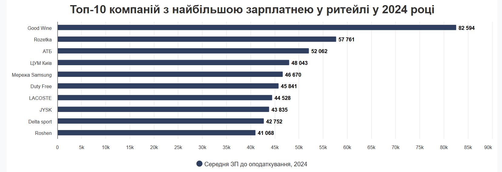 - Самые высокие зарплаты в сфере торговли в Украине получают работники сети GoodWine, где средняя зарплата превышает 82 тысячи гривен в месяц.