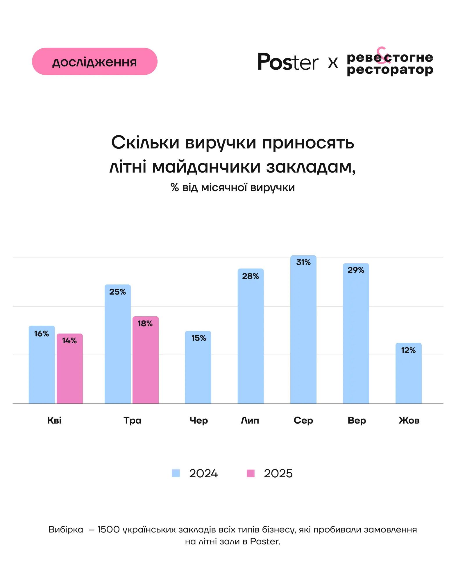 - Літні майданчики в середньому дають закладам близько 21% щомісячного доходу, а в серпні їхня частка може зрости до 30%.