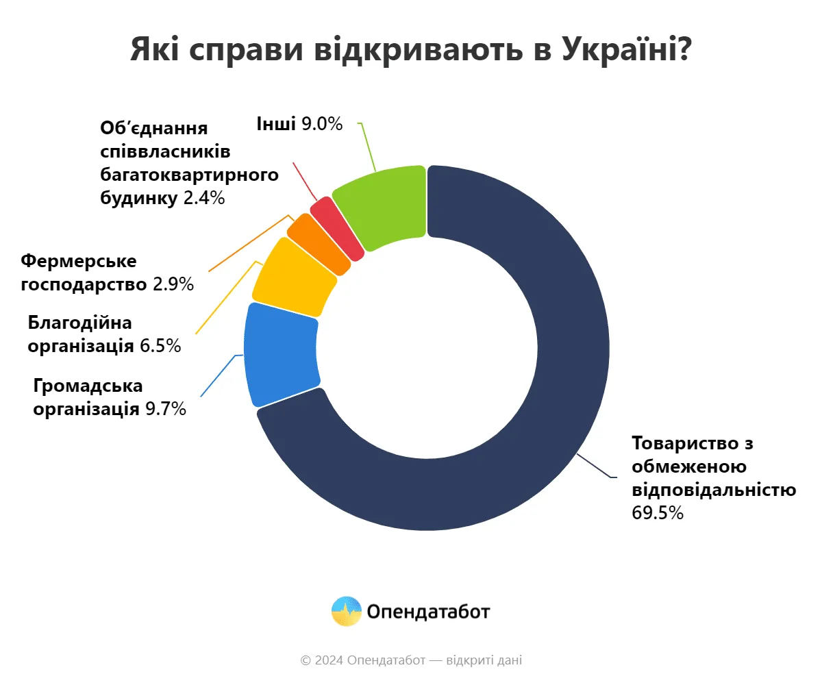 З них 69% або близько 12 тисяч – це товариства з обмеженою відповідальністю. На другому місці – ГО, понад 1700 реєстрацій. Трійку лідерів замикають благодійні організації, вони складають 6,5% від загального обсягу.
