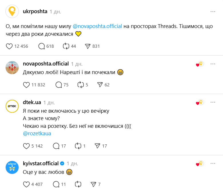 - У липні цього року Укрпошта та "Нова пошта" обмінялися жартами у соцмережі Threads. У своєму дописі "Укрпошта" привітала свого конкурента з долучення до платформи, але аж через 2 роки після її створення.