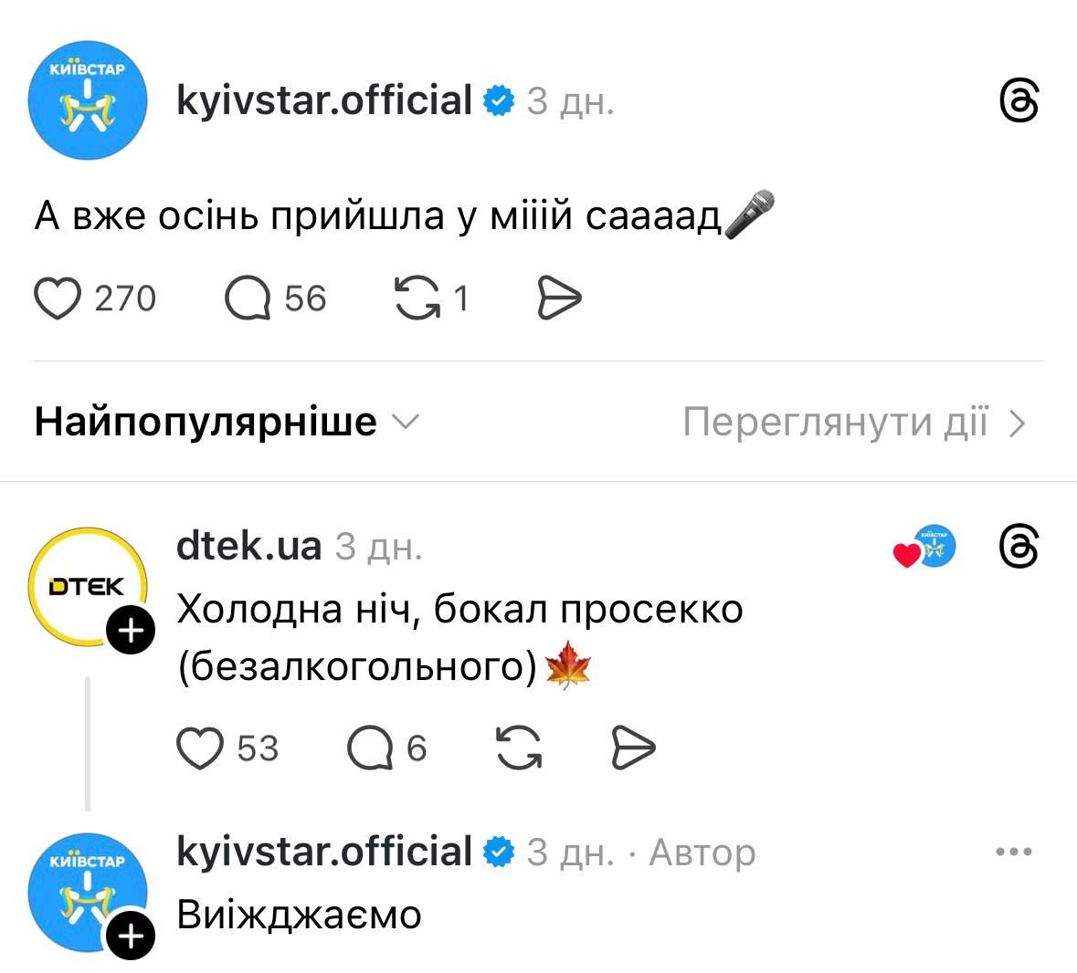 - На сторінці в Therads "Київстар" написав рядки з пісні "А вже осінь прийшла у мій сад", яку співає Іво Бобул.