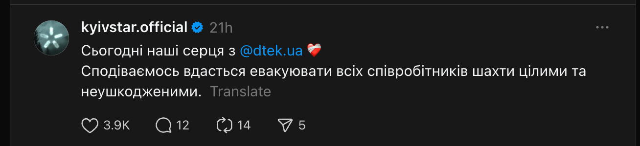 Взаємодія "Київстар" та DTEK / Скриншот з Threads