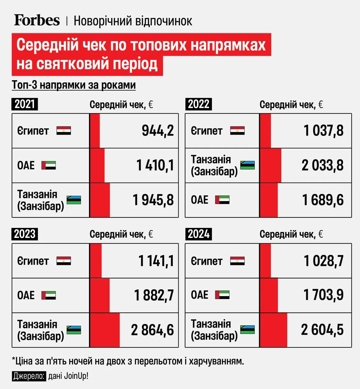 За словами керівної директорки "Join UP! Україна" Ірини Мосулезної, найбільший попит мають Єгипет, ОАЕ та екзотичні напрямки на кшталт Занзібару.