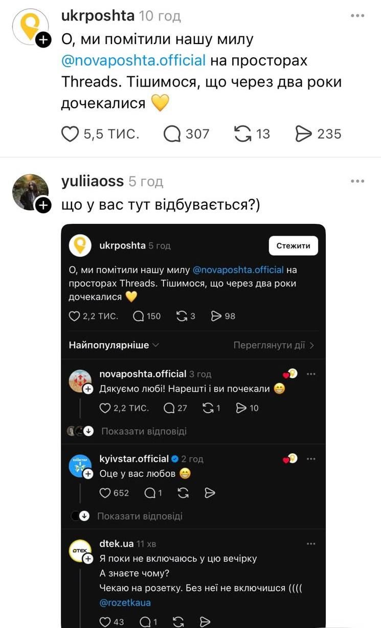 - Укрпошта та "Нова пошта" обмінялися жартами у соцмережі Threads, до обговорення приєдналися інші бренди як ДТЕК та "Київстар".