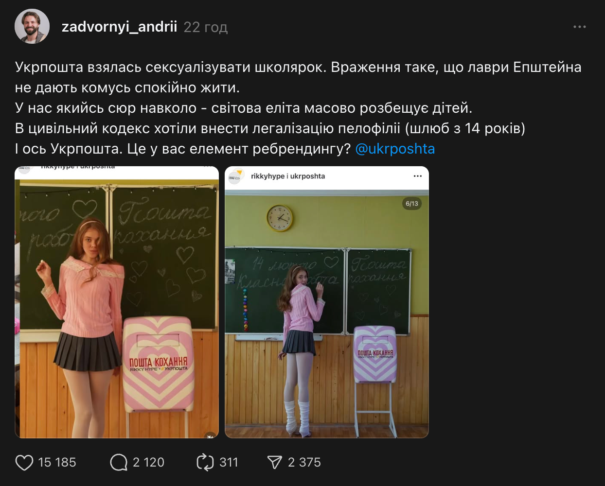 Публікація, що викликала резонанс, – це наша помилка. Передусім моя особиста. Ми не врахували важливий контекст чутливої теми, а саме обговорення скандалу з плівками Епштейна, дискусії щодо змін в законодавстві про вік дозволу на шлюб та ребрендинг Укрпошти. В цьому контексті ухвалили невірне рішення, і я це визнаю,