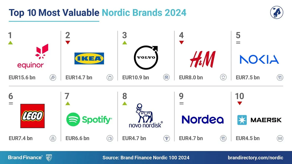 До десятки увійшли такі бренди як H&M, Spotify, Nordea, Lego, Novo Nordics, Maersk і Nokia.