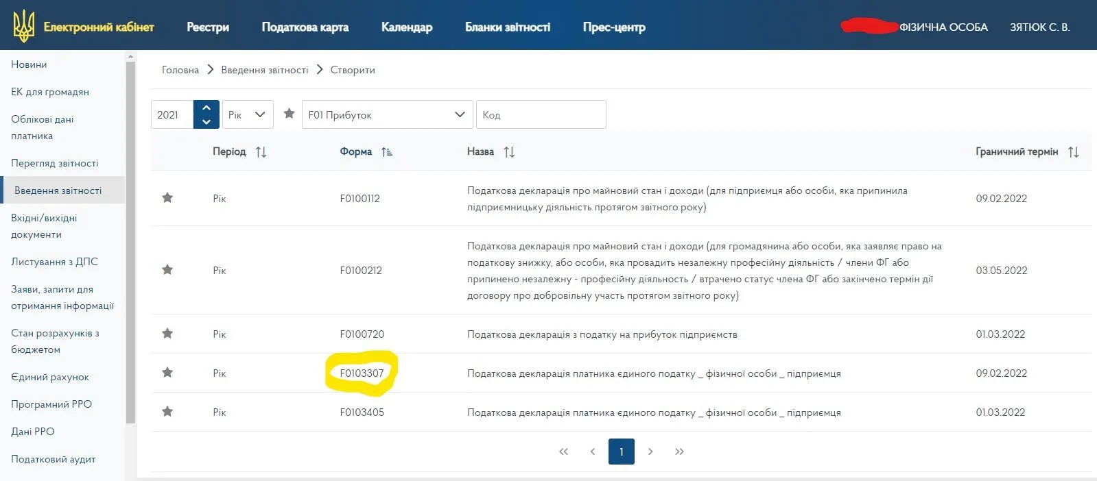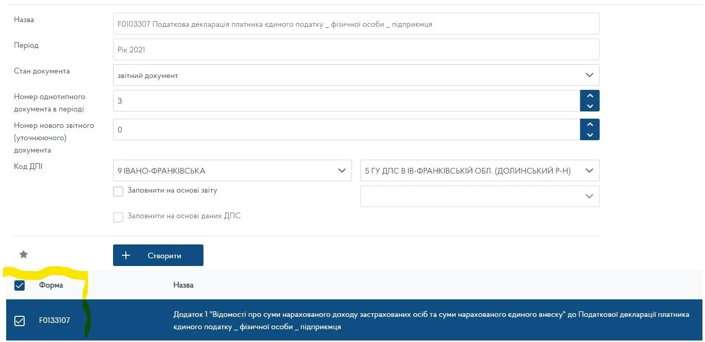 У ньому потрібно обрати розділ "Введення звітності" і натиснути на опцію "Створити". У контекстних полях обираємо: "2021", "Рік", "F01 Прибуток", а у випадаючому списку – форму F0103307.