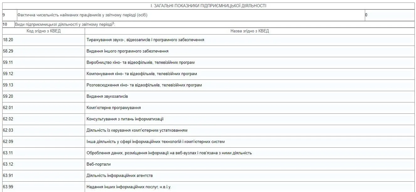 У 10 рядку декларації варто вказати усі КВЕДи (Класифікатори видів економічної діяльності), за якими ви здійснювали діяльність у 2021 році. Щоб нічого не пропустити, радимо вказати усі КВЕДи, за якими зареєстрований ваш ФОП. Повний перелік можна знайти у витязі з реєстру платників єдиного податку або за окремим запитом за вашим ідентифікаційним номером.