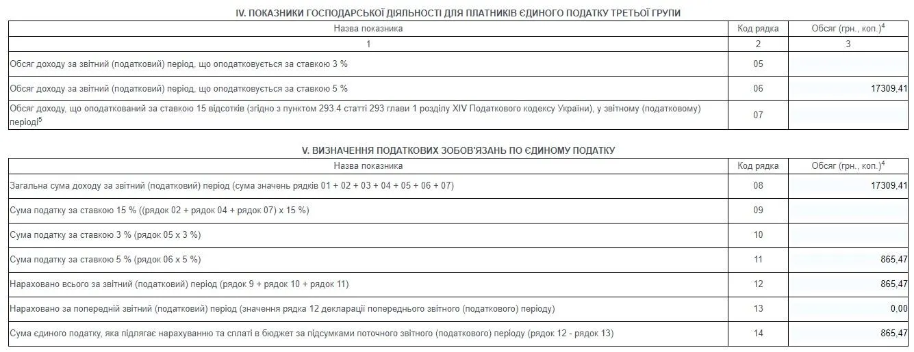 У розділі V "Визначення податкових зобов'язань по єдиному податку" у коді рядка 08 дублюємо суму надходжень з коду рядка 06. Тоді у кодах рядків 11 та 12 автоматично обчислиться сума єдиного податку (5% від вказаного річного доходу).