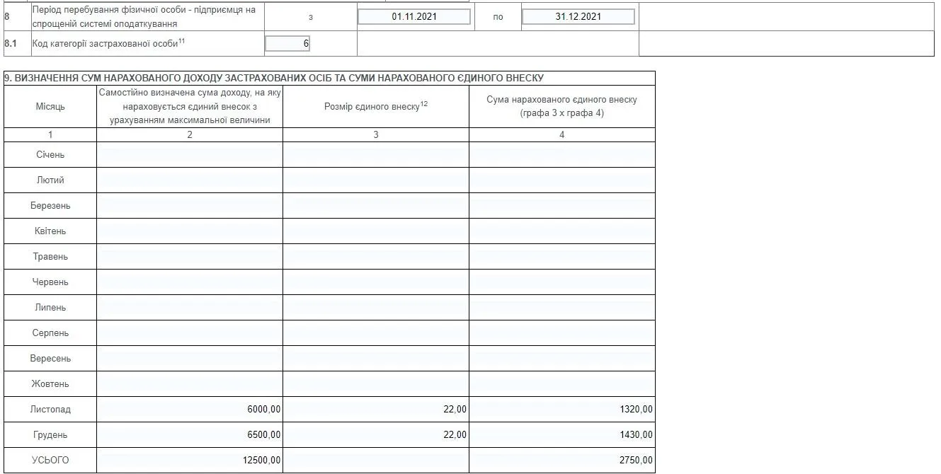 Далі у рядку 8.1 вказуємо код категорії застрахованої особи. Для ФОП 3 групи на спрощеній системі оподаткування це значення дорівнює "6".