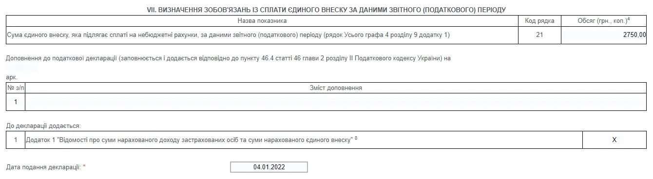 Після заповнення "Додатка 1" потрібно повернутись до головного документа. У коді рядка 21 автоматично має заповнитись сума єдиного внеску з "Додатка 1". Якщо цього не відбулось, вписуємо її самостійно.