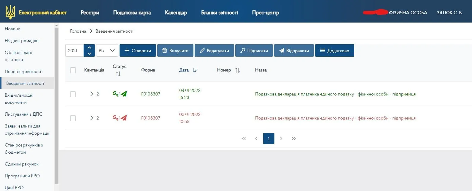 - Річна форма F0103405 "Податкова декларація платника єдиного податку фізичної особи підприємця";