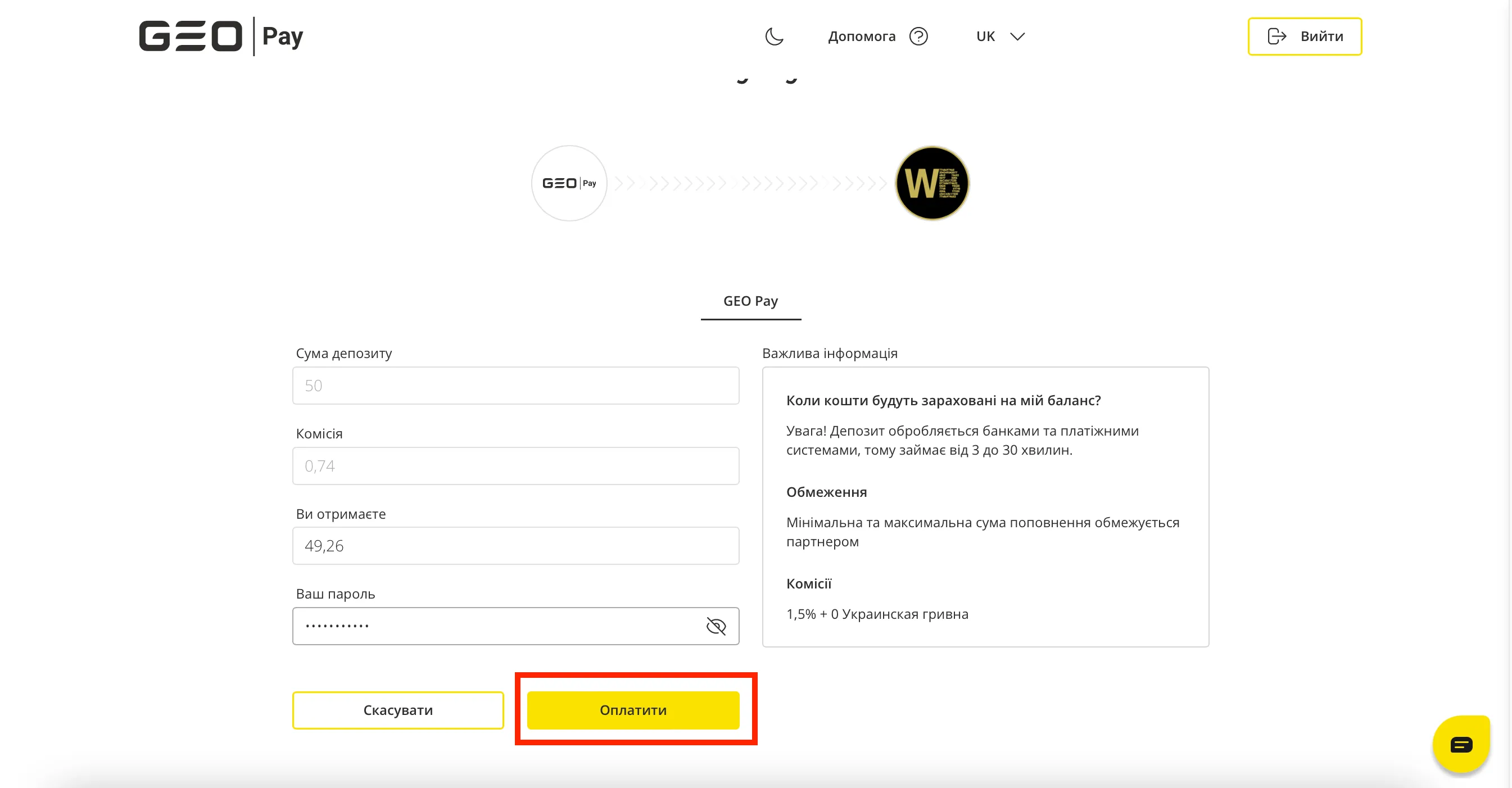 5. У новому вікні підтвердіть оплату своїм паролем GEO Pay.