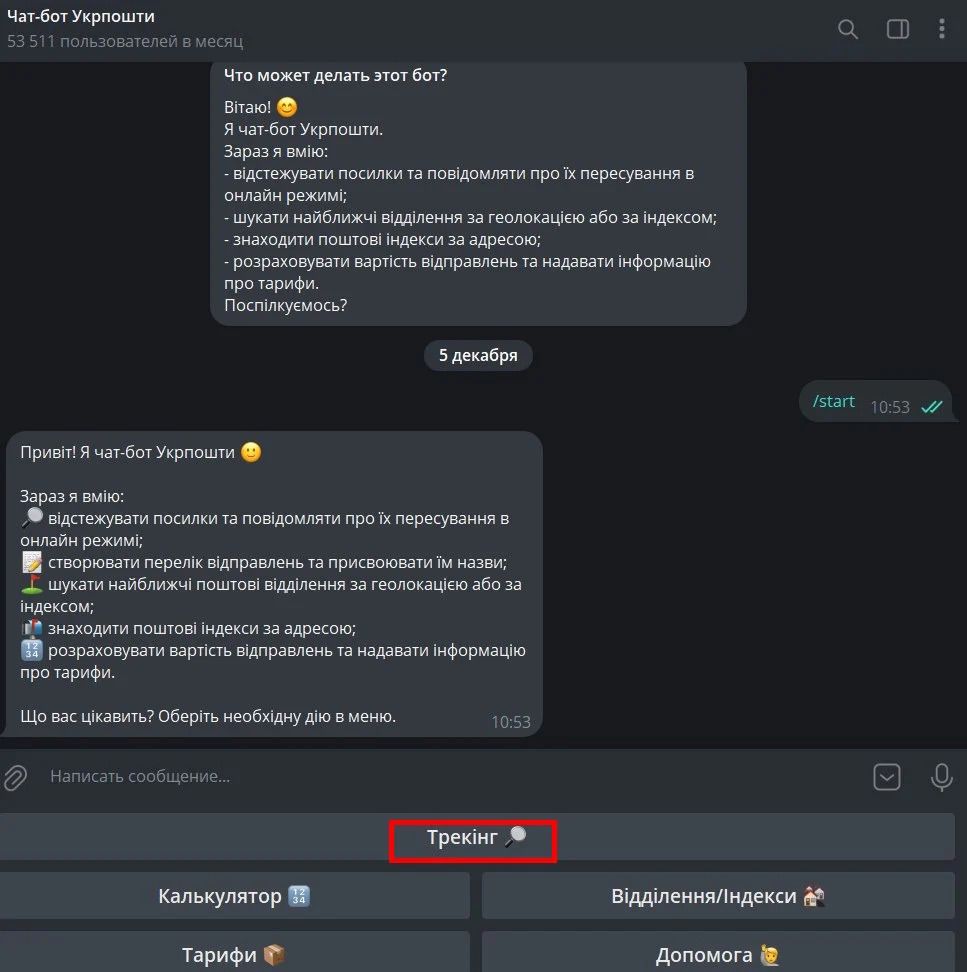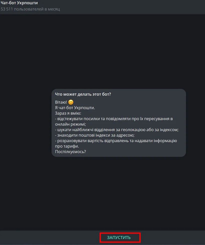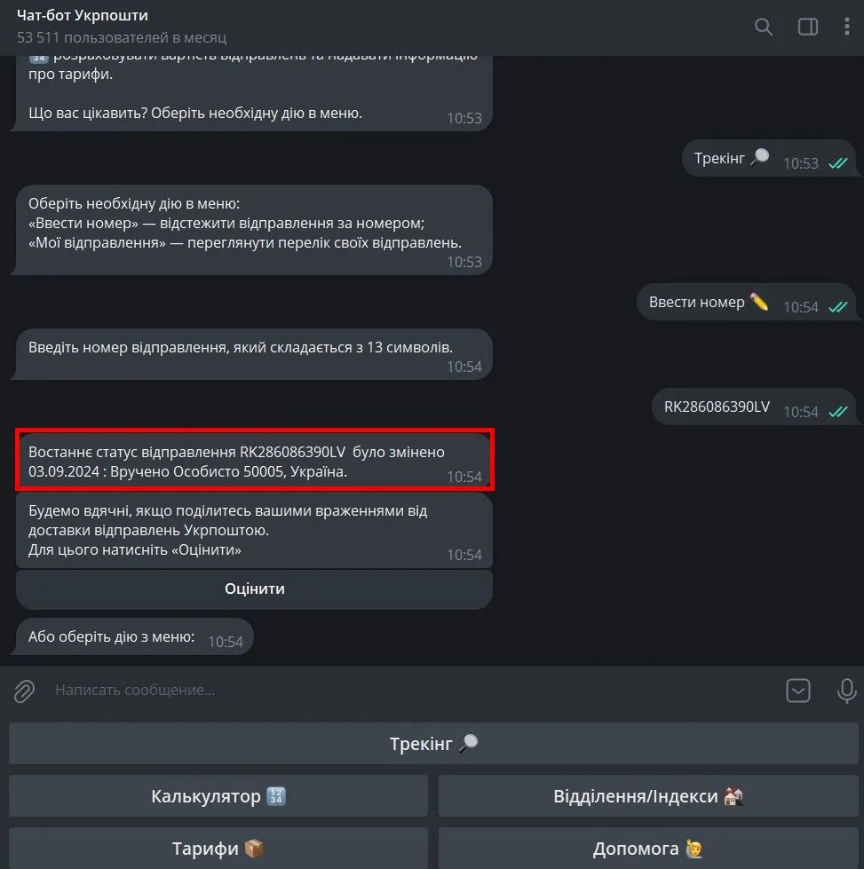 Якщо ж ви не маєте змоги перевірити цю інформацію на офіційному сайті, відстежити відправлення можна, використовуючи чат-бот Укрпошти у Telegram. Ось, як це зробити: